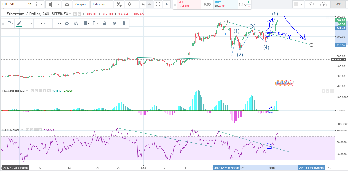 Ethereum looks to be completing a condensed overlapping 5 wave move to new highs. It triggered a solid entry based on our trading system indicated below. However this should only be seen as a quick flip as it is in the last stages of a 5 wave push.